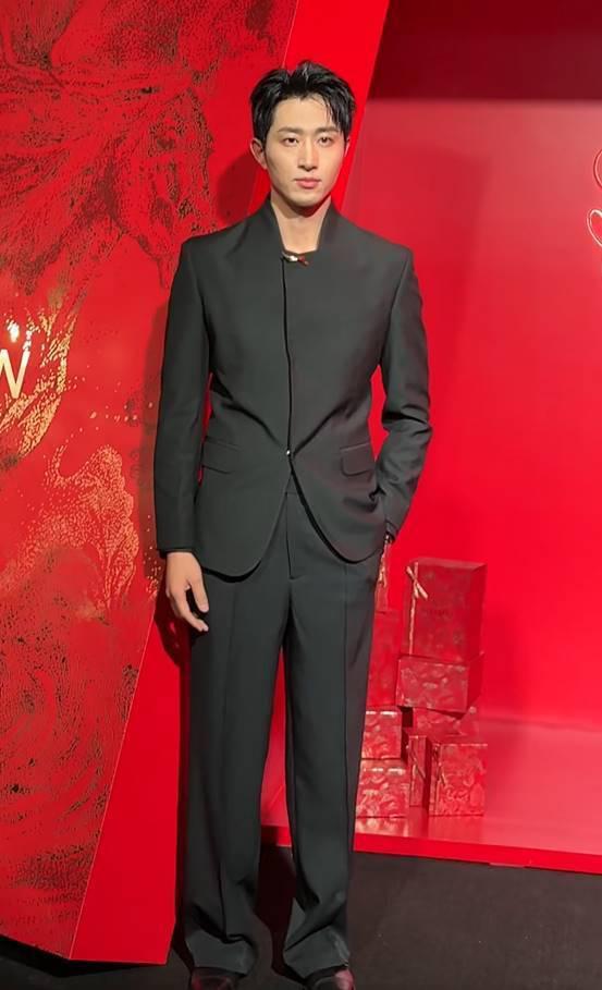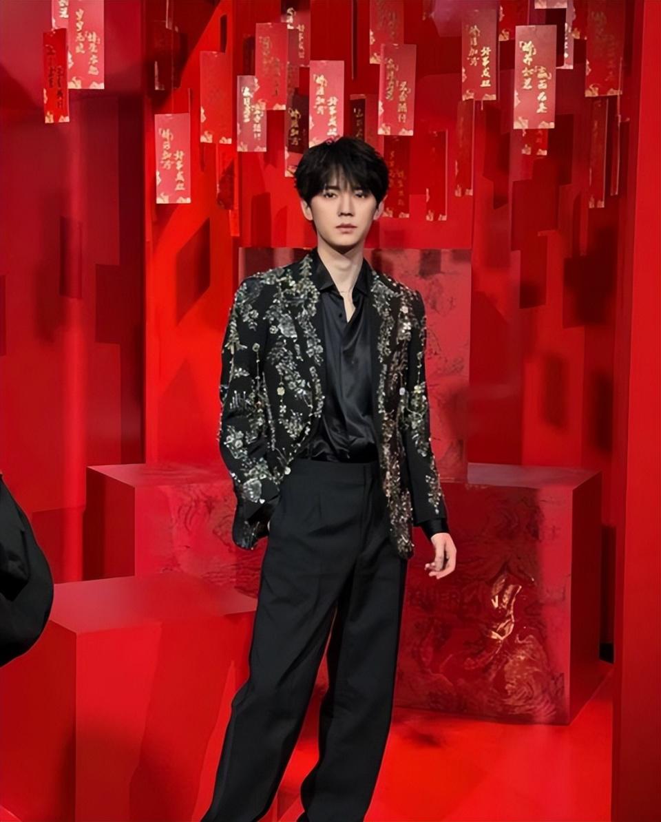 黑金色刺绣西装在闪光灯下流光溢彩,黑发顺毛刘海轻松拿捏少年感。